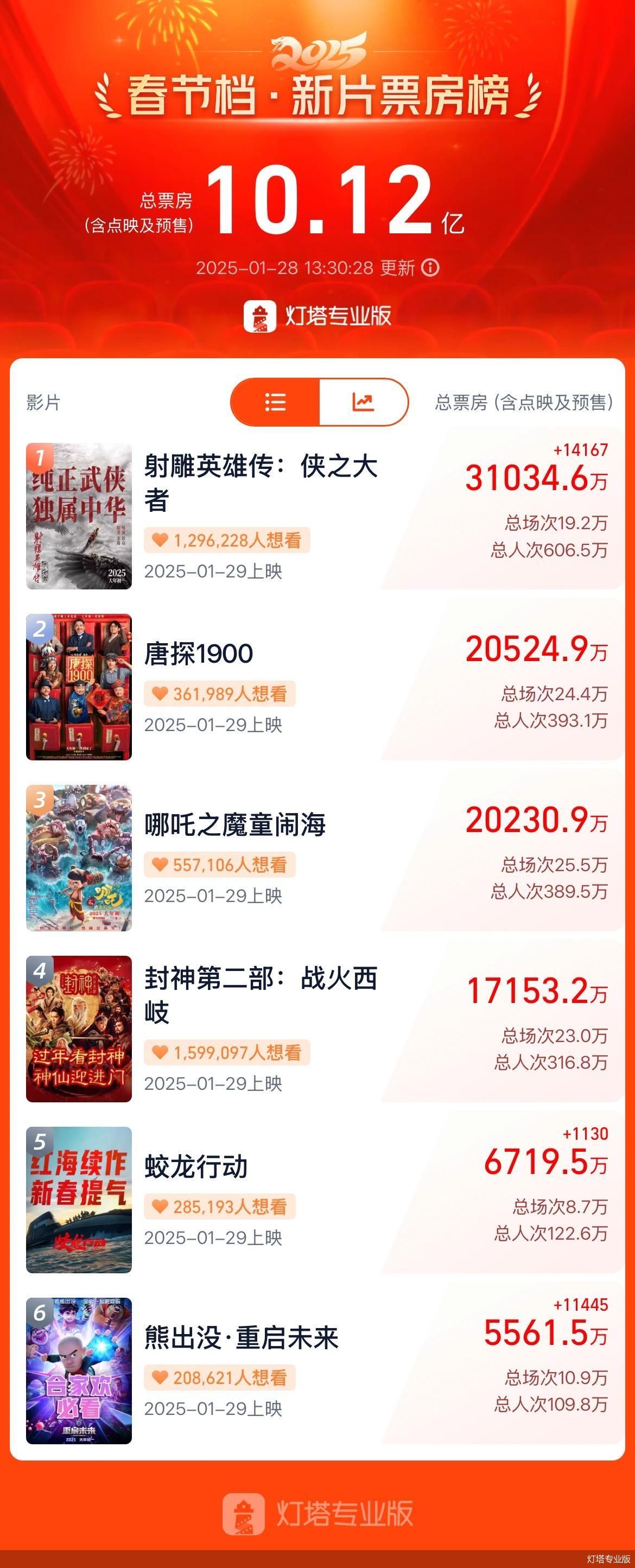 据灯塔专科版泄露,2025年春节档首日(1月29日)上映的6部新片中,电影《射雕英杰传:侠之大者》总票房(含点映及预售)达31034.6万元,位于春节新片票房榜首位;《唐探1900》和《哪吒之魔童闹海》总票房(含点映及预售)区分为20524.9万元和20230.9万元,位于春节档新片票房榜第二和第三位。
